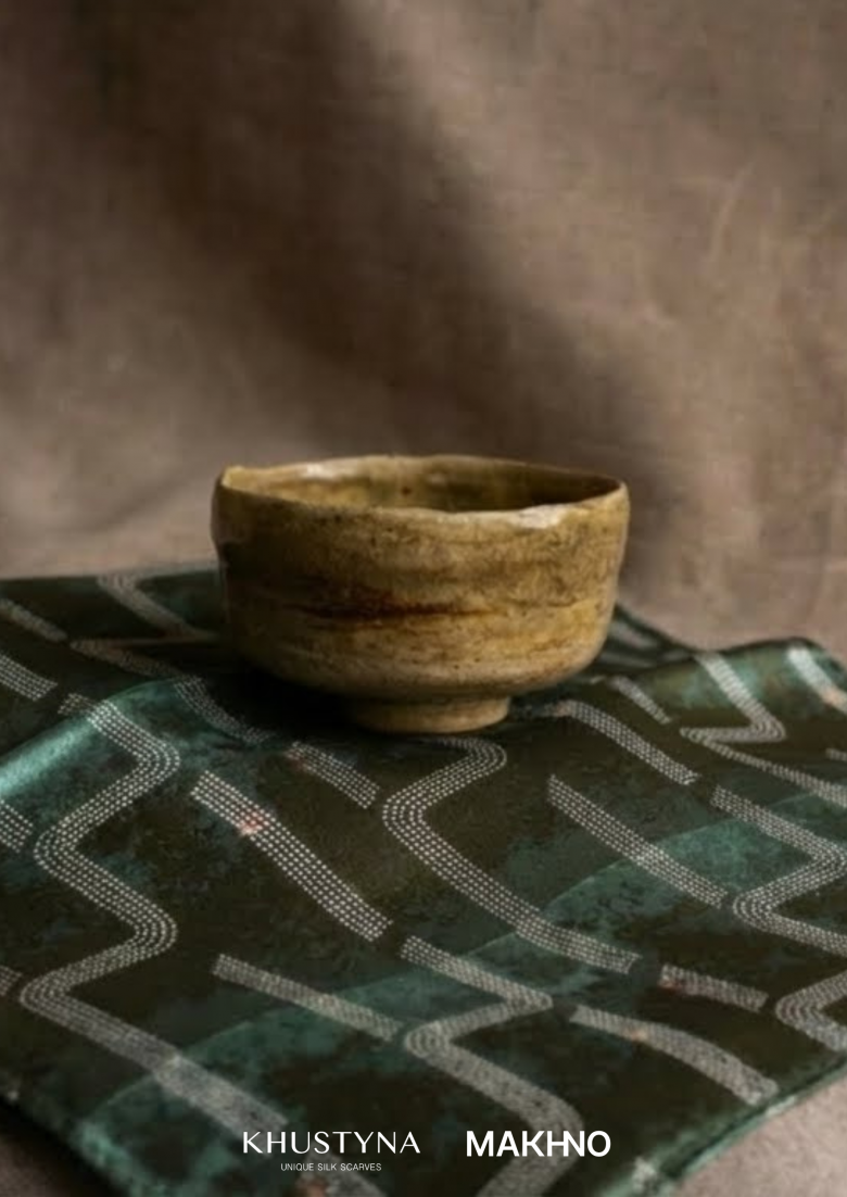 4. «Туркот» — дизайн хустини натхненний васильківською керамікою як архетипом коріння та безперервності роду. Назва «Туркот» (японською — Saezuri) втілює філософію присутності: це не гучний спів, а живий звук птахів, що свідчить про тяглість життя тут і зараз.